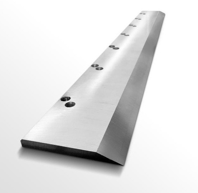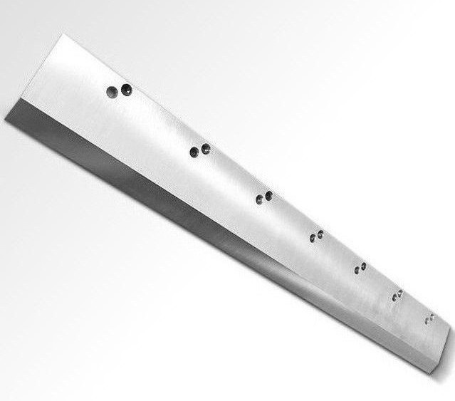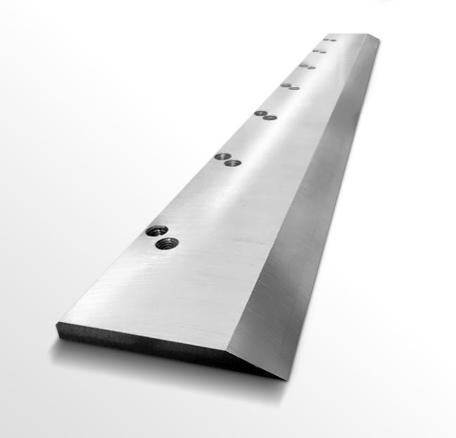 A long, narrow special steel knife installed on a guillotine, driven hydraulically for vertical and swinging cuts.